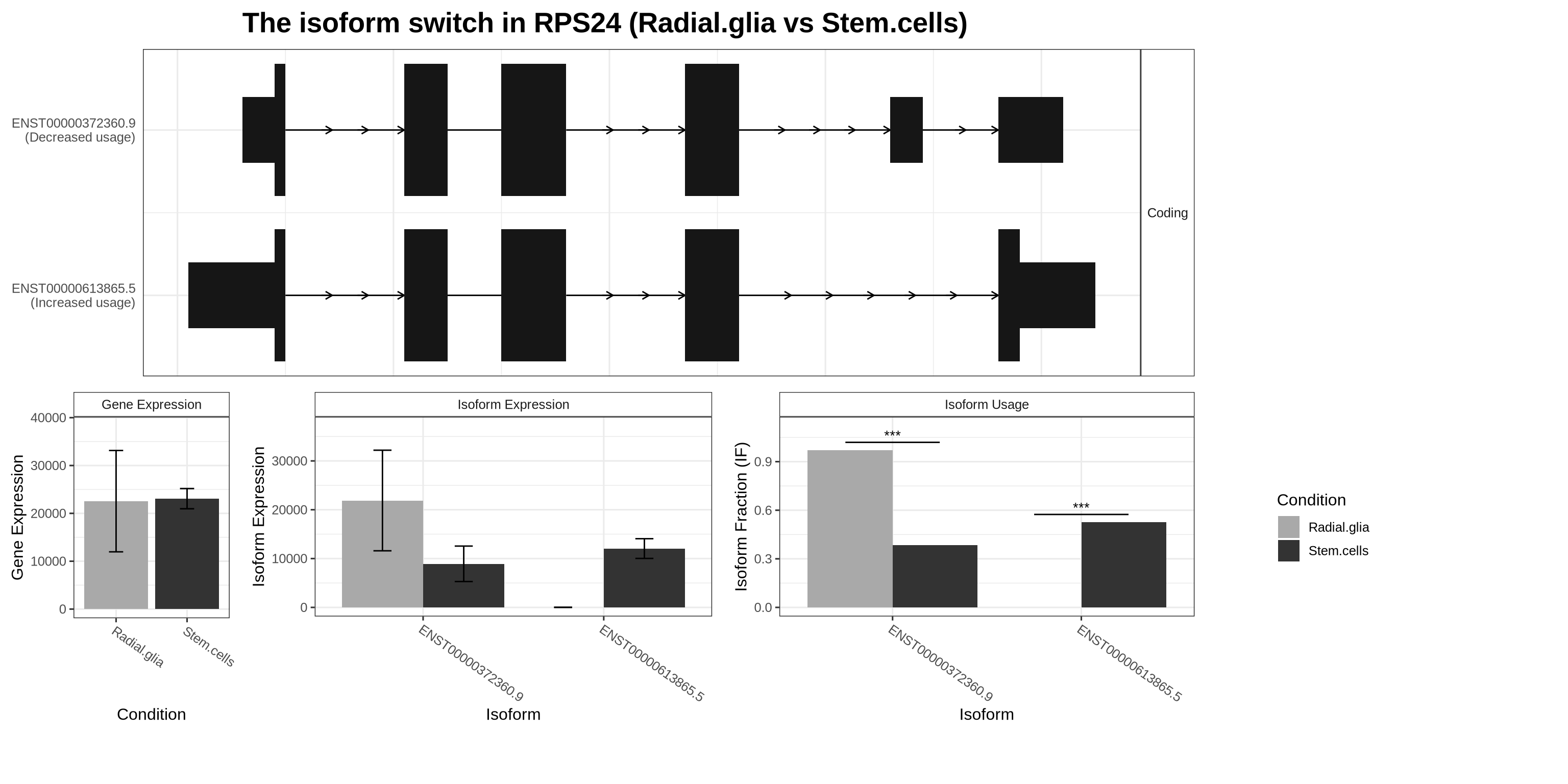 The switch plot is composed of several panels. At the top, we see the isoform structures for the two RPS24 isoforms tested. Notably, ENST00000613865.5 is missing the penultimate exon, and the two isoforms have different ORFs, yet both are classified as coding. Below, the bar charts summarise overall gene expression and isoform-level expression across conditions. The panel on the right shows the key result: isoform usage (relative proportion) in each condition. In this example, stem cells use a higher proportion of ENST00000613865.5, whereas radial glia preferentially use ENST00000372360.9, illustrating a clear isoform switch between these two cell types.