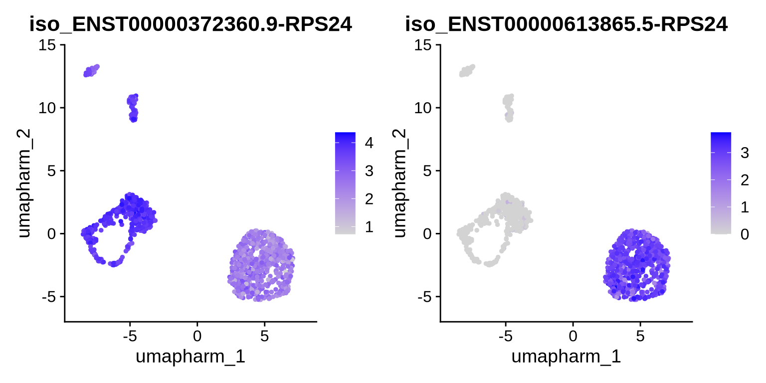 FeaturePlot(obj, features = c("ENST00000372360.9-RPS24", "ENST00000613865.5-RPS24"), reduction = "umap.harm")