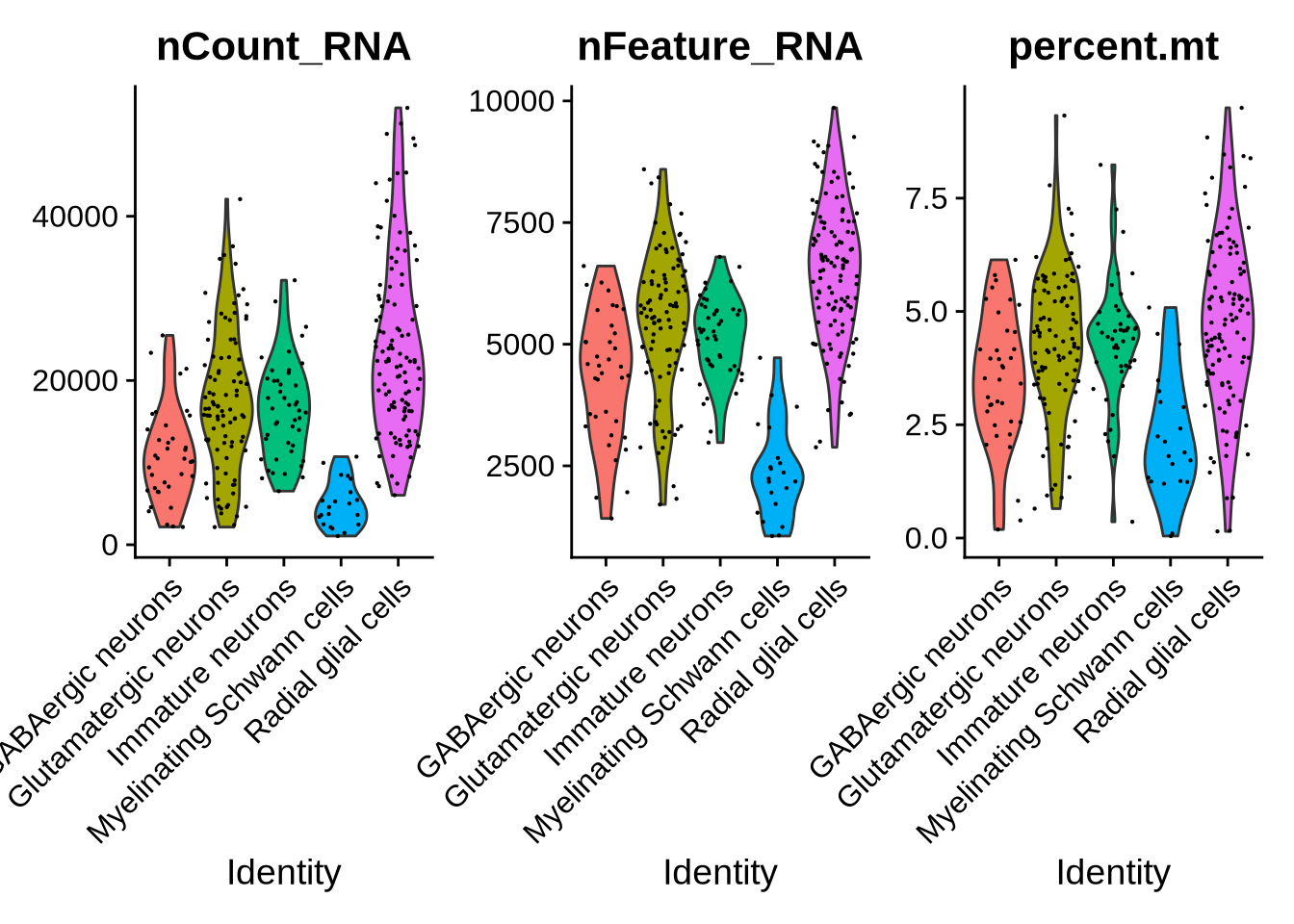 Based on the plots above, Myelinating Schwann cells show markedly fewer detected features and lower total counts compared to other populations. Additionally, the expression profiles indicate that this cluster lacks canonical radial glial markers such as VIM, SOX2, and PAX6 (shown above). Differential expression analysis using the FindAllMarkers function also revealed a high proportion of ribosomal genes among the top markers for this cluster.