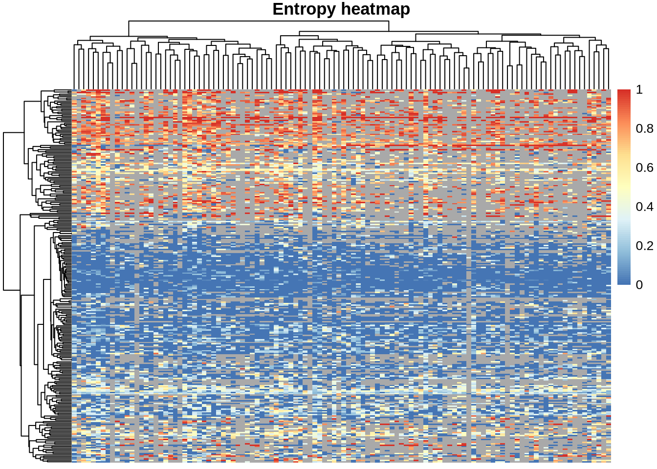 We can summarise these results in a heatmap. In this plot, each column is a single cell and each row is a gene that passed filtering. Grey regions indicate cell–gene combinations where there were not enough counts to calculate entropy for that gene in that cell.