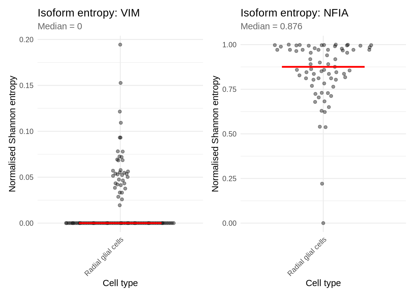 In the case of Radial Glial cells, this approach reveals a mixture of both expression modes: some genes like VIM exhibit low isoform diversity, consistent with stable structural roles, whereas others like NFIA show high entropy, reflecting more dynamic or context-dependent regulation.