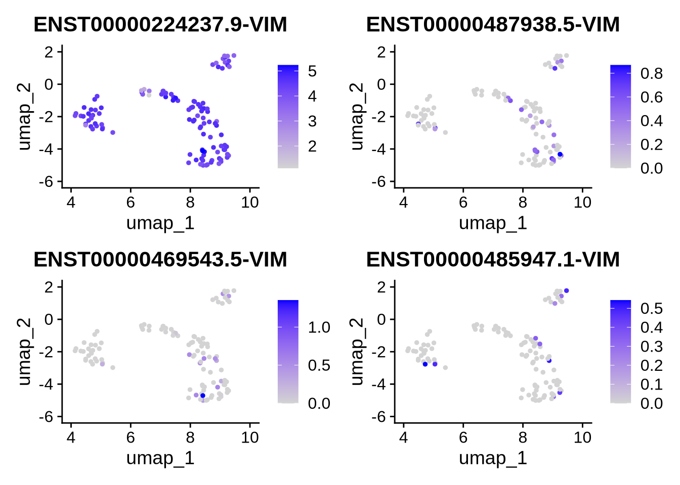 Let’s look at VIM in a bit more detail. VIM is a simple in the sense that nearly all counts for these gene belong to the canonical isoform. We can plot this on a UMAP as shown bellow.
